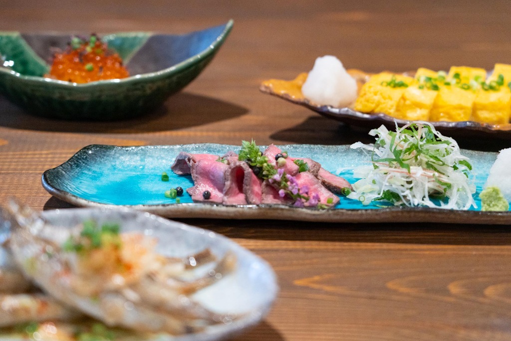 ※仕入れによって変動がありますので、あくまで一例です。・冷奴・枝豆・だし巻き玉子・鮭とイクラおろし・ネギトロとガーリックチーズ・鶏ムネ肉の低温調理~梅肉ソース~・鶏モモ肉の西京味噌カマンベール焼き・和牛のスジ煮込み・ローストビーフ・豚の角煮~温泉卵添え~